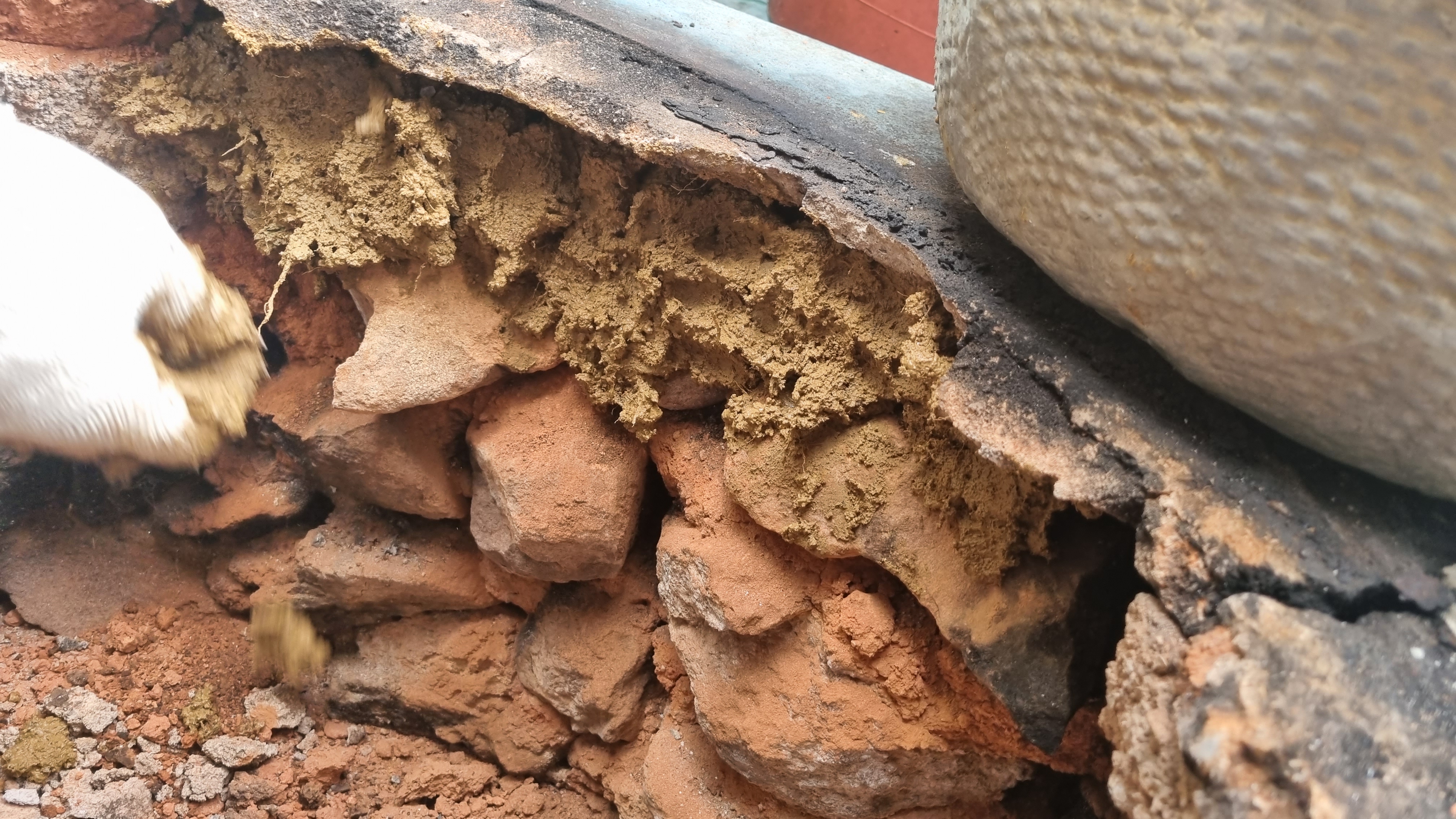면장갑을 착용하여 부서진 곳이나 돌이 고정이 안 된 곳에 흙을 고르게 발라주면 되는데 제일 중요한 것이 흙의 반죽입니다. 너무 무르게 하거나 너무 찰지게 하면 잘 안 붙는 경우가 있기 때문에 작업을 하면서 반죽을 추가로 조정해 주면 됩니다.